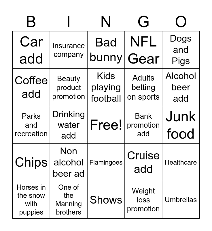 This bingo card has a free space and 24 words: Non alcohol beer ad, One of the Manning brothers, Kids playing football, Horses in the snow with puppies, Dogs and Pigs, Car add, Coffee add, Insurance company, Bank promotion add, Flamingoes, Adults betting on sports, Parks and recreation, Cruise add, Healthcare, Beauty product promotion, Weight loss promotion, Junk food, Bad bunny, Alcohol beer add, Drinking water add, Umbrellas, Chips, NFL Gear and Shows.