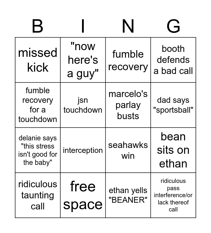 This bingo card has 24 words: aj starts bouncing to bad bunny, mom cries at a commercial, dad says "sportsball", leilani cheers on "starbucks", fumble recovery for a touchdown, missed kick, jsn touchdown, "now here's a guy", free space, malcom butler gets mentioned, delanie says "this stress isn't good for the baby", seahawks win, patriots win, non-qb passing attempt, marcelo's parlay busts, cass says "im so bloated", ethan yells "BEANER", fumble recovery, interception, bean sits on ethan, ridiculous taunting call, ridiculous pass interference/or lack thereof call, booth defends a bad call and cardi b gets a shoutout.