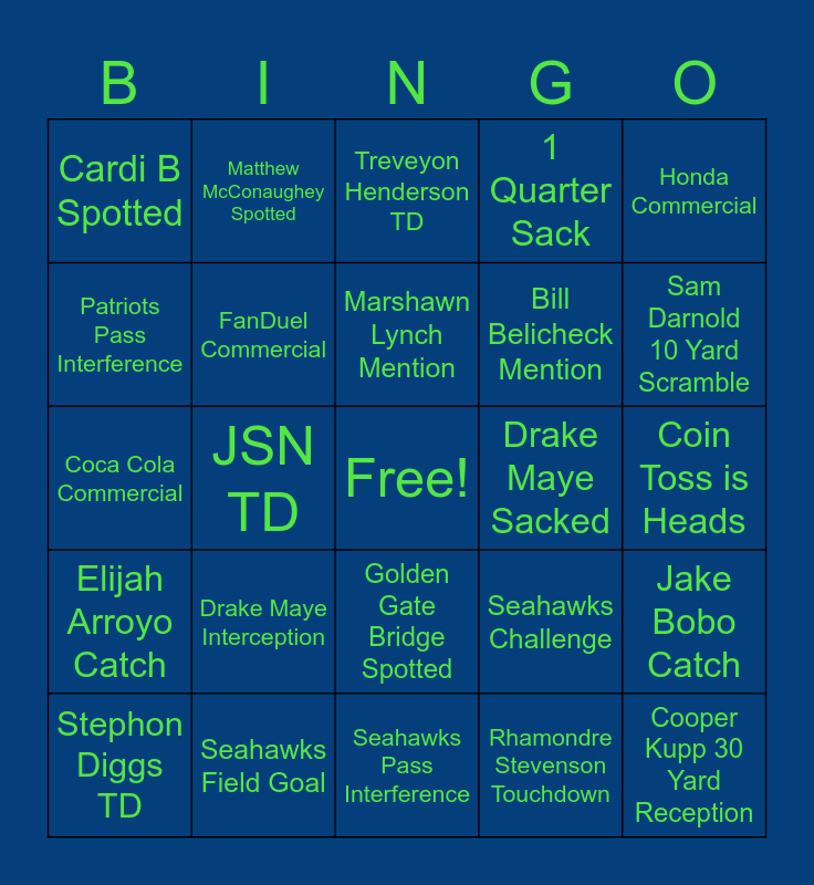 This bingo card has a free space and 24 words: Drake Maye Interception, Seahawks Field Goal, Marshawn Lynch Mention, Stephon Diggs TD, Honda Commercial, Cardi B Spotted, Patriots Pass Interference, Matthew McConaughey Spotted, Drake Maye Sacked, Golden Gate Bridge Spotted, Bill Belicheck Mention, Coca Cola Commercial, Seahawks Challenge, Jake Bobo Catch, FanDuel Commercial, Rhamondre Stevenson Touchdown, Coin Toss is Heads, Treveyon Henderson TD, Sam Darnold 10 Yard Scramble, JSN TD, Cooper Kupp 30 Yard Reception, Elijah Arroyo Catch, 1 Quarter Sack and Seahawks Pass Interference.