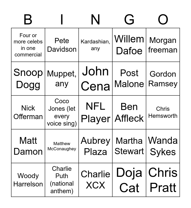 This bingo card has a free space and 30 words: Charlie Puth (national anthem), Brandi Carlile (america the beautiful), Coco Jones (let every voice sing), Bad Bunny (halftime show), Four or more celebs in one commercial, Kardashian, any, Muppet, any, Aubrey Plaza, Ben Affleck, Charlie XCX, Chris Hemsworth, Chris Pratt, Doja Cat, Eugene Levy, Gordon Ramsey, Harrison Ford, Martha Stewart, Matt Damon, Matthew McConaughey, Morgan freeman, Nick Offerman, Orlando bloom, Pete Davidson, Post Malone, Snoop Dogg, Willem Dafoe, Wanda Sykes, Woody Harrelson, John Cena and Dhar Mann.