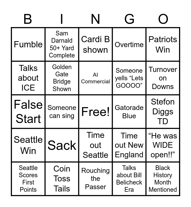 This bingo card has a free space and 44 words: FIFA world cup mentioned, Black History Month Mentioned, Beer Commercial, Seattle Scores First Points, Field Goal, Talks about Bill Belicheck Era, Cardi B shown, Field Goal, Patriots Win, Coin Toss Tails, Overtime, Gatorade Blue, Time out Seattle, Sack, Challenge Play, Rouching the Passer, Roger Bullying Someone, False Start, Touch Down Kenneth Walker, Turnover on Downs, Sam Darnald 50+ Yard Complete, QB Throws It away, Coin Toss Heads, Fumble, Pick 6, Stefon Diggs TD, Dropped Pass, Tom Brady Shown, Time out New England, Seattle Win, Someone naps before 4th QTR, “He was WIDE open!!”, Patriots Scores First Points, Bill Belicheck Girlfriend mentioned, Someone can sing, Sports Betting Ad, Surprise Halftime Guest, Puppy Commercial, AI Commercial, Talks about ICE, Someone yells “Lets GOOOO”, Complaint about Ref, Golden Gate Bridge Shown and Gatorade Red.