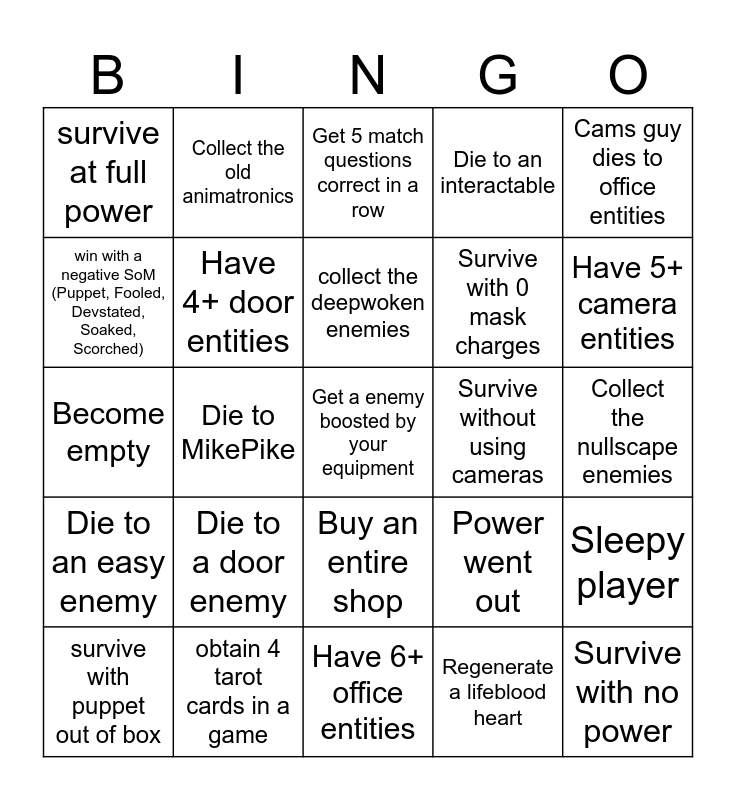 This bingo card has a free space and 24 words: Die to a door enemy, obtain 4 tarot cards in a game, collect the deepwoken enemies, survive with puppet out of box, Cams guy dies to office entities, survive at full power, win with a negative SoM (Puppet, Fooled, Devstated, Soaked, Scorched), Collect the old animatronics, Survive without using cameras, Buy an entire shop, Survive with 0 mask charges, Become empty, Power went out, Sleepy player, Have 4+ door entities, Regenerate a lifeblood heart, Collect the nullscape enemies, Get 5 match questions correct in a row, Have 5+ camera entities, Die to MikePike, Survive with no power, Die to an easy enemy, Die to an interactable and Have 6+ office entities.