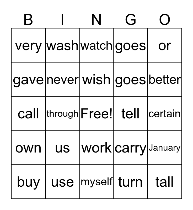 This bingo card has a free space and 24 words: us, use, wish, buy, or, very, gave, wash, tell, work, goes, call, carry, January, never, turn, certain, watch, better, through, tall, own, goes and myself.