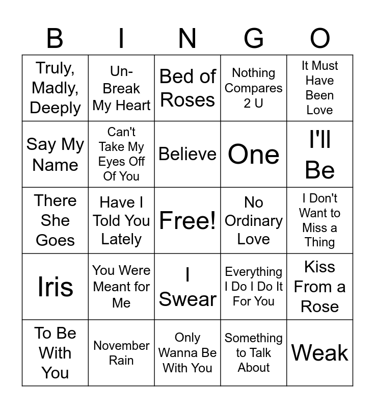 This bingo card has a free space and 43 words: Baby, Baby, Weak, That's the Way Love Goes, To Be With You, Wicked Game, Something to Talk About, Bed of Roses, Back at One, It Must Have Been Love, November Rain, Nothing Compares 2 U, No Ordinary Love, I Swear, You Were Meant for Me, More Than Words, Only Wanna Be With You, I'll Make Love to You, There She Goes, Wonderwall, I'll Be, Un-Break My Heart, Head Over Feet, As Long As You Love Me, Truly, Madly, Deeply, Can You Feel the Love Tonight, I Don't Want to Miss a Thing, Two Princes, Kiss Me, Everything I Do I Do It For You, Iris, This Kiss, Kiss From a Rose, I'll Stand By You, Have I Told You Lately, My Heart Will Go On, Always Be My Baby, Fantasy, Believe, Say My Name, One, Criminal, Can't Take My Eyes Off Of You and Lovefool.