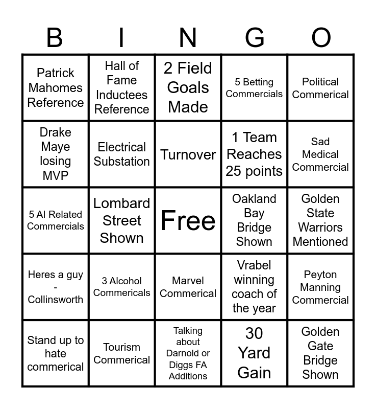 This bingo card has a free space and 24 words: Stand up to hate commerical, 3 Alcohol Commericals, Turnover, 30 Yard Gain, Political Commerical, Patrick Mahomes Reference, Hall of Fame Inductees Reference, 2 Field Goals Made, Oakland Bay Bridge Shown, Golden State Warriors Mentioned, 5 AI Related Commercials, Electrical Substation, Vrabel winning coach of the year, Peyton Manning Commercial, Drake Maye losing MVP, Tourism Commerical, Talking about Darnold or Diggs FA Additions, 5 Betting Commercials, Sad Medical Commercial, Heres a guy -Collinsworth, Lombard Street Shown, Marvel Commerical, 1 Team Reaches 25 points and Golden Gate Bridge Shown.