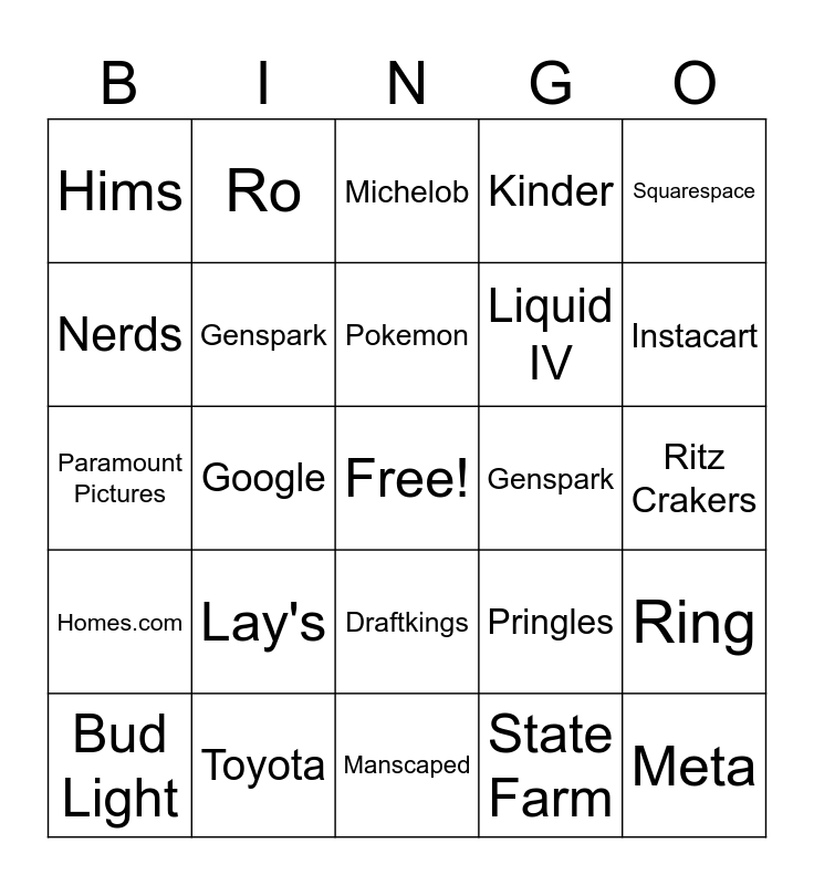 This bingo card has a free space and 24 words: Lay's, Toyota, Pokemon, Bud Light, Squarespace, Hims, Nerds, Ro, Genspark, Draftkings, Liquid IV, Paramount Pictures, Pringles, Ring, Genspark, State Farm, Ritz Crakers, Michelob, Instacart, Google, Meta, Homes.com, Kinder and Manscaped.