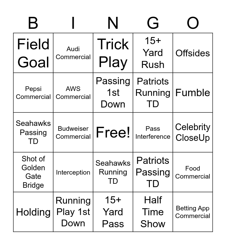 This bingo card has a free space and 24 words: Interception, Running Play 1st Down, Passing 1st Down, Holding, Offsides, Field Goal, Pepsi Commercial, Audi Commercial, Pass Interference, Seahawks Running TD, Patriots Running TD, Seahawks Passing TD, Patriots Passing TD, Food Commercial, AWS Commercial, Half Time Show, Celebrity CloseUp, Trick Play, Fumble, Budweiser Commercial, Betting App Commercial, Shot of Golden Gate Bridge, 15+ Yard Rush and 15+ Yard Pass.
