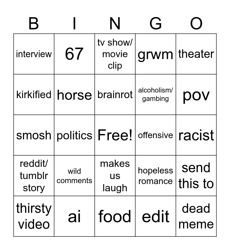 This bingo card has a free space and 24 words: wild comments, ai, brainrot, thirsty video, theater, interview, kirkified, 67, offensive, makes us laugh, alcoholism/ gambing, smosh, hopeless romance, send this to, horse, edit, racist, tv show/ movie clip, pov, politics, dead meme, reddit/ tumblr story, grwm and food.