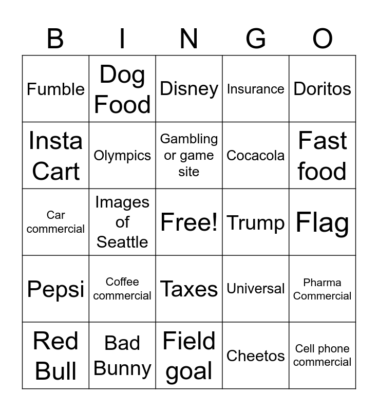 This bingo card has a free space and 29 words: Red Bull, Images of Boston, Images of Seattle, Interception, Fumble, Disney, Olympics, Coffee commercial, Trump, Bad Bunny, Flag, Cell phone commercial, Field goal, Cheetos, Fast food, Touch down Pats, Taxes, Pepsi, Doritos, Car commercial, Universal, Budweiser, Cocacola, Insta Cart, Insurance, Dog Food, Pharma Commercial, Gambling or game site and Movie preview.