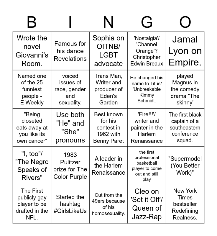 This bingo card has a free space and 24 words: 1983 Pulitzer prize for The Color Purple, Started the hashtag #GirlsLikeUs, Trans Man, Writer and producer of Eden's Garden, The First publicly gay player to be drafted in the NFL., Jamal Lyon on Empire., Wrote the novel Giovanni's Room., Named one of the 25 funniest people - E Weekly, Famous for his dance Revelations, 'Fire!!!'/ writer and painter in the Harlem Renaissance, A leader in the Harlem Renaissance, He changed his name to Titus/ 'Unbreakable Kimmy Schmidt., "Being closeted eats away at you like its own cancer", the first professional basketball player to come out and still play, "Supermodel (You Better Work)", voiced issues of race, gender and sexuality., Cleo on 'Set it Off'/ Queen of Jazz-Rap, The first black captain of a southeastern conference squad., Sophia on OITNB/ LGBT advocate, played Magnus in the comedy drama "The skinny', Use both "He" and "She" pronouns, New York Times bestseller Redefining Realness., "I, too"/ "The Negro Speaks of Rivers", 'Nostalgia'/ 'Channel Orange'? Christopher Edwin Breaux and Cut from the 49ers because of his homosexuality..