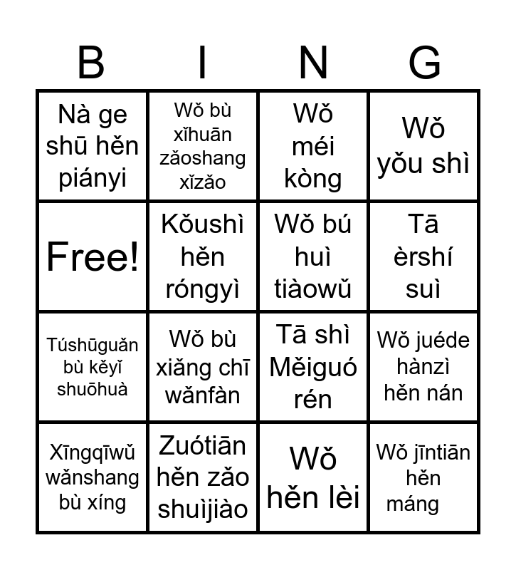 This bingo card has 16 words: Zuótiān hěn zǎo shuìjiào, Wǒ juéde hànzì hěn nán, Wǒ méi kòng, Nà ge shū hěn piányi, Túshūguǎn bù kěyǐ shuōhuà, Wǒ bù xǐhuān zǎoshang xǐzǎo, Tā shì Měiguó rén, Wǒ hěn lèi, Free!, Kǒushì hěn róngyì, Xīngqīwǔ wǎnshang bù xíng, Wǒ yǒu shì, Wǒ bù xiǎng chī wǎnfàn, Tā èrshí suì, Wǒ bú huì tiàowǔ and Wǒ jīntiān hěn máng.