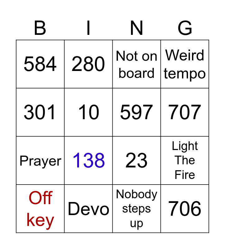 This bingo card has 23 words: 706, 2, 707, 178, 301, 584, 10, 280, Off key, 740, 138, Prayer, Same verse twice, Reads verse, Devo, Same song, Not on board, 23, 597, Light The Fire, Weird tempo, Nobody steps up and Two people step up.