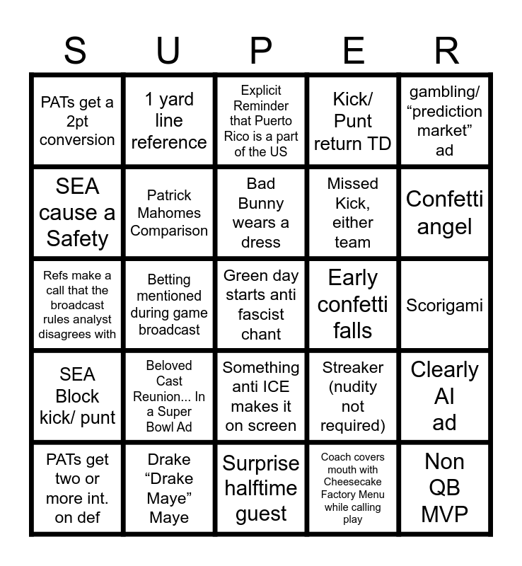 This bingo card has 25 words: SEA Block kick/ punt, Drake “Drake Maye” Maye, Green day starts anti fascist chant, Coach covers mouth with Cheesecake Factory Menu while calling play, gambling/ “prediction market” ad, PATs get a 2pt conversion, 1 yard line reference, Explicit Reminder that Puerto Rico is a part of the US, Early confetti falls, Clearly AI ad, SEA cause a Safety, Patrick Mahomes Comparison, Surprise halftime guest, Streaker (nudity not required), Confetti angel, PATs get two or more int. on def, Betting mentioned during game broadcast, Bad Bunny wears a dress, Missed Kick, either team, Scorigami, Refs make a call that the broadcast rules analyst disagrees with, Beloved Cast Reunion... In a Super Bowl Ad, Something anti ICE makes it on screen, Kick/ Punt return TD and Non QB MVP.