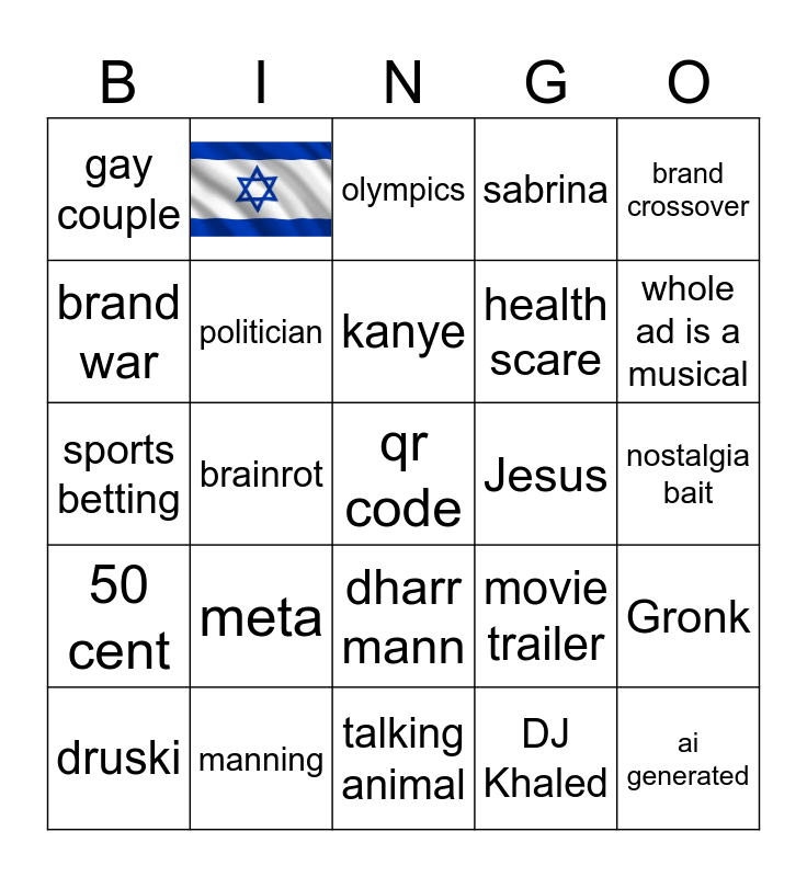 This bingo card has 1 images and 24 words: meta, talking animal, kanye, druski, brand crossover, gay couple, brand war, Jesus, dharr mann, health scare, sports betting, movie trailer, Gronk, politician, ai generated, nostalgia bait, olympics, whole ad is a musical, brainrot, qr code, manning, 50 cent, sabrina and DJ Khaled.
