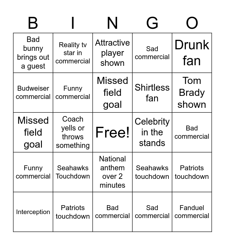 This bingo card has a free space and 24 words: Seahawks Touchdown, Patriots touchdown, Missed field goal, Interception, Drunk fan, Bad bunny brings out a guest, Budweiser commercial, Reality tv star in commercial, Celebrity in the stands, National anthem over 2 minutes, Shirtless fan, Missed field goal, Seahawks touchdown, Patriots touchdown, Funny commercial, Sad commercial, Bad commercial, Attractive player shown, Tom Brady shown, Coach yells or throws something, Fanduel commercial, Funny commercial, Sad commercial and Bad commercial.