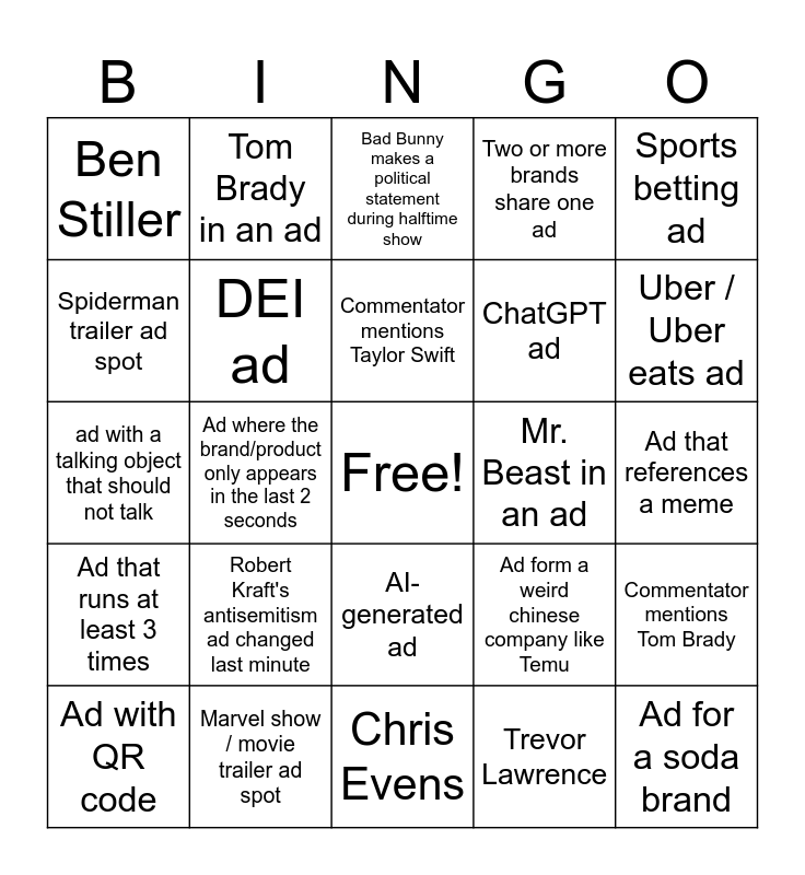 This bingo card has a free space and 32 words: Trevor Lawrence, AI ad that doesn’t explain what the product actually does, Ad where the brand/product only appears in the last 2 seconds, Same celebrity in two different ads, Ad that runs at least 3 times, DEI ad, Sports betting ad, Commentator mentions Tom Brady, Tom Brady in an ad, Taylor Swift in an ad, Commentator mentions Taylor Swift, Bad Bunny makes a political statement during halftime show, Commentator says “You dream about moments like this”, Ad trying to be self-aware about Super Bowl ads, Mr. Beast in an ad, Surprise guest appears during halftime show, Ad with QR code, ad with a talking object that should not talk, AI-generated ad, Robert Kraft's antisemitism ad changed last minute, Ad form a weird chinese company like Temu, Crypto ad, Ad that references a meme, Marvel show / movie trailer ad spot, Ad for a soda brand, Two or more brands share one ad, ChatGPT ad, Spiderman trailer ad spot, Ben Stiller, Chris Evens, Avengers trailer ad spot and Uber / Uber eats ad.
