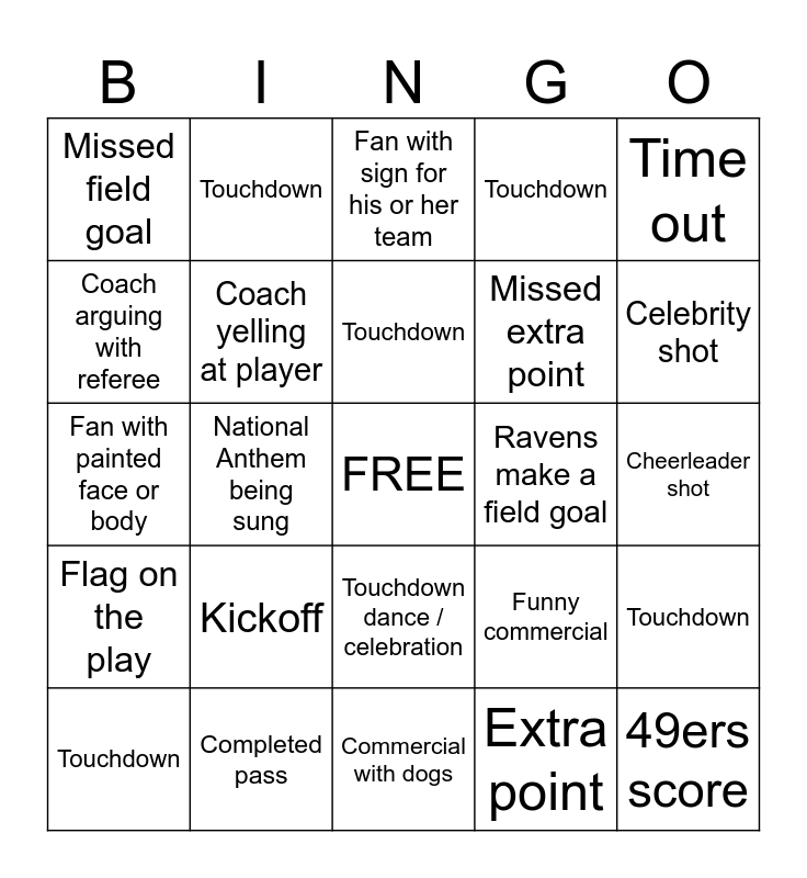 This bingo card has a free space and 29 words: Touchdown, Commercial with Babies, National Anthem being sung, Chip commercial, Missed field goal, Fan with sign for his or her team, Coach yelling at player, Kickoff, Ravens make a field goal, Completed pass, Cheerleader shot, 49ers score, Commercial with dogs, Extra point, Celebrity shot, Commercial with cars, Touchdown dance / celebration, Flag on the play, Time out, Fan with painted face or body, Funny commercial, Commercial for snack foods, Missed extra point, Coach arguing with referee, Touchdown, Touchdown, Touchdown, Touchdown and Touchdown.