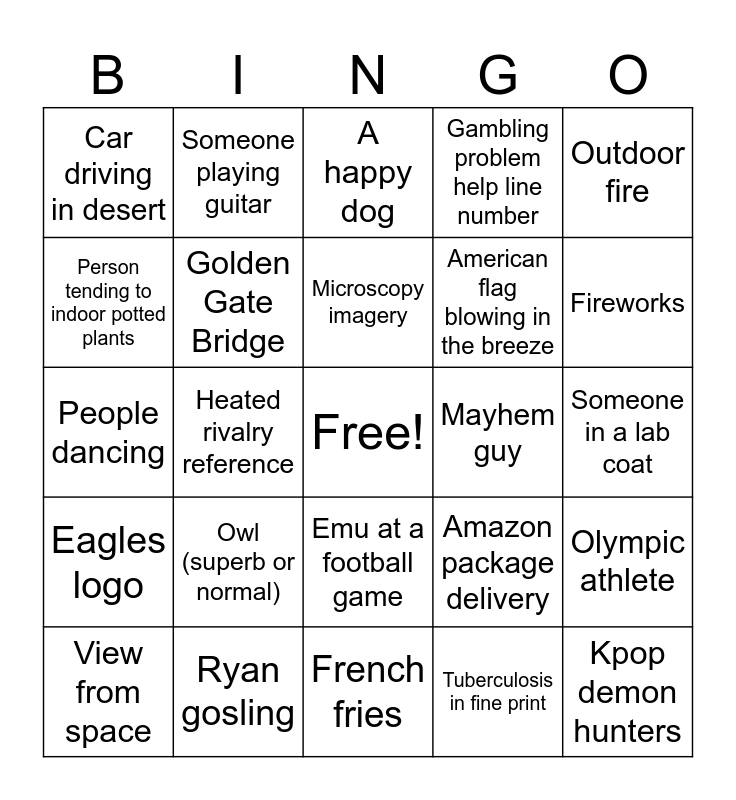 This bingo card has a free space and 24 words: Owl (superb or normal), Ryan gosling, Microscopy imagery, View from space, Outdoor fire, Car driving in desert, Person tending to indoor potted plants, Someone playing guitar, Mayhem guy, Emu at a football game, American flag blowing in the breeze, People dancing, Amazon package delivery, Olympic athlete, Golden Gate Bridge, Tuberculosis in fine print, Someone in a lab coat, A happy dog, Fireworks, Heated rivalry reference, Kpop demon hunters, Eagles logo, Gambling problem help line number and French fries.