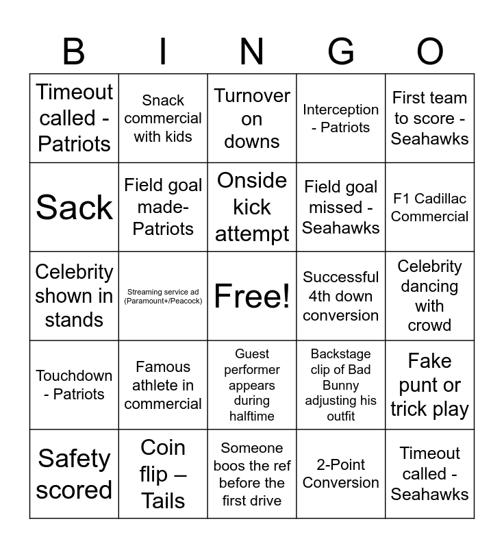 This bingo card has a free space and 59 words: Coin flip – Heads, Coin flip – Tails, Touchdown - Seahawks, Touchdown - Patriots, 2-Point Conversion, Field goal made- Seahawks, Field goal made- Patriots, Field goal missed - Patriots, Field goal missed - Seahawks, Interception - Seahawks, Interception - Patriots, Fumble, Sack, Offensive pass interference, Challenge flag thrown, Timeout called - Patriots, Timeout called - Seahawks, First team to score - Seahawks, First team to score - Patriots, Onside kick attempt, Successful 4th down conversion, Turnover on downs, Safety scored, Fake punt or trick play, Beer commercial (e.g., Budweiser, Coors), Car commercial, Food/snack commercial, Movie trailer ad, F1 Cadillac Commercial, Commercial with a dog, Talking animal in ad, Celebrity cameo in commercial, Ad with QR code shown, Crypto/tech commercial, Snack commercial with kids, Super dramatic car chase ad, Emotional soda commercial, Streaming service ad (Paramount+/Peacock), Movie franchise trailer, Celebrity shown in stands, Celebrity announced during halftime act, Famous athlete in commercial, Celebrity dancing with crowd, Coach reacts visibly (gestures, yelling), Announcer mentions past Super Bowl, Fan in costume, Player does heart hands celebration, Costume change during halftime, Guest performer appears during halftime, Someone boos the ref before the first drive, Commentator says “You can’t make that mistake in the Super Bowl”, Someone yells “HE WAS WIDE OPEN!”, Someone on TV wearing sunglasses indoors at night, Announcer mentions a celebrity relationship, Bad Bunny performs a Spanish-only song, Backstage clip of Bad Bunny adjusting his outfit, Bad Bunny uses a huge hat or crazy costume piece, Any comment about the Alternative Super Bowl Show and Someone screams “WAKE ME UP WHEN THE GAME ENDS”.