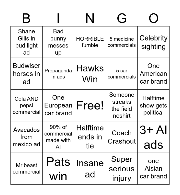 This bingo card has a free space and 24 words: 90% of commercial made with AI, Pats win, Hawks Win, Mr beast commercial, Celebrity sighting, Shane Gilis in bud light ad, Budwiser horses in ad, Bad bunny messes up, Someone streaks the field noshirt, Halftime ends in tie, 5 car commercials, Cola AND pepsi commercial, Coach Crashout, 3+ AI ads, Propaganda in ads, Super serious injury, Halftime show gets political, HORRIBLE fumble, One American car brand, One European car brand, one Aisian car brand, Avacados from mexico ad, 5 medicine commercials and Insane ad.