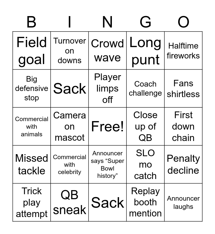 This bingo card has a free space and 24 words: Commercial with celebrity, QB sneak, Player limps off, Trick play attempt, Halftime fireworks, Field goal, Big defensive stop, Turnover on downs, Close up of QB, Announcer says “Super Bowl history”, Coach challenge, Commercial with animals, SLO mo catch, Penalty decline, Sack, Replay booth mention, First down chain, Crowd wave, Fans shirtless, Camera on mascot, Announcer laughs, Missed tackle, Long punt and Sack.