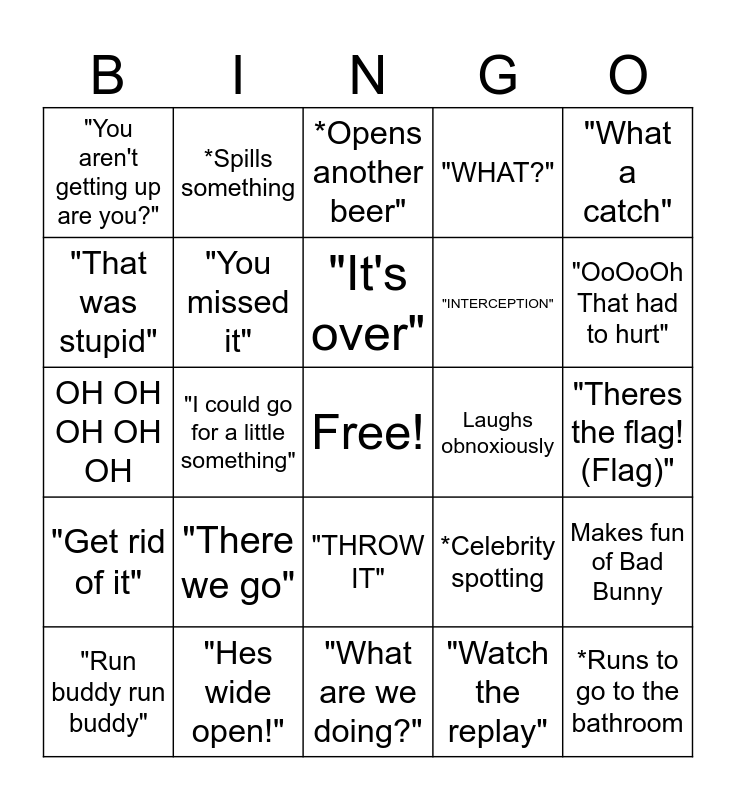 This bingo card has a free space and 25 words: "There we go", "What are we doing?", "It's over", "Run buddy run buddy", "What a catch", "You aren't getting up are you?", "That was stupid", *Spills something, Laughs obnoxiously, "THROW IT", "INTERCEPTION", OH OH OH OH OH, *Celebrity spotting, Makes fun of Bad Bunny, "You missed it", *Disses on the refs, "Theres the flag! (Flag)", *Opens another beer", "OoOoOh That had to hurt", "I could go for a little something", *Runs to go to the bathroom, "Hes wide open!", "Get rid of it", "WHAT?" and "Watch the replay".