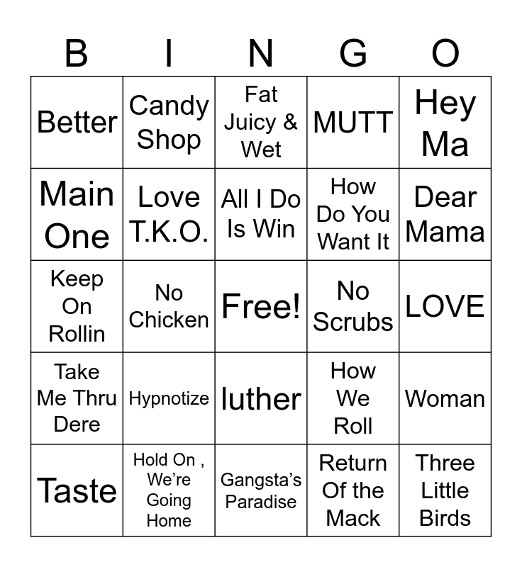 This bingo card has a free space and 40 words: Boots On The Ground, Keep On Rollin, Take It to da House, Love T.K.O., Hold On , We’re Going Home, luther, All I Do Is Win, Talk Dirty, Hey Ma, Take Me Thru Dere, No Chicken, MUTT, Three Little Birds, LOVE, No Scrubs, Hypnotize, Lovin On Me, Better, Pour It Up, Fat Juicy & Wet, Woman, Return Of the Mack, How Do You Want It, Main One, First Class, Gin and Juice, Regulate, Get Low, BOO, The Way You Move, I Wanna Love You, Taste, Sure Thing, How We Roll, Dear Mama, Gangsta’s Paradise, Get It Shawty, Love You Down, Candy Shop and Empire State Of Mind.