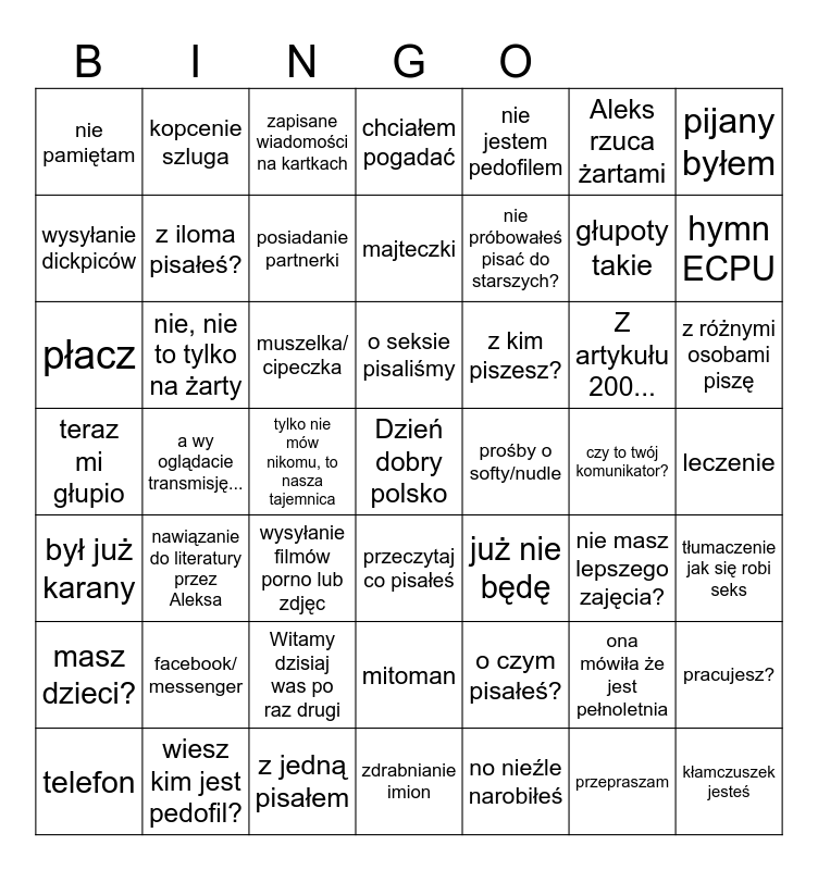 This bingo card has a free space and 48 words: o czym pisałeś?, głupoty takie, zdrabnianie imion, a wy oglądacie transmisję..., muszelka/ cipeczka, leczenie, kopcenie szluga, wiesz kim jest pedofil?, Aleks rzuca żartami, przeczytaj co pisałeś, pijany byłem, chciałem pogadać, Z artykułu 200..., z kim piszesz?, masz dzieci?, czy to twój komunikator?, wysyłanie dickpiców, hymn ECPU, ona mówiła że jest pełnoletnia, nie jestem pedofilem, nie próbowałeś pisać do starszych?, tylko nie mów nikomu, to nasza tajemnica, nie pamiętam, z iloma pisałeś?, pracujesz?, posiadanie partnerki, z różnymi osobami piszę, telefon, o seksie pisaliśmy, nie, nie to tylko na żarty, przepraszam, prośby o softy/nudle, tłumaczenie jak się robi seks, facebook/ messenger, teraz mi głupio, już nie będę, nie masz lepszego zajęcia?, płacz, wysyłanie filmów porno lub zdjęc, Witamy dzisiaj was po raz drugi, był już karany, kłamczuszek jesteś, zapisane wiadomości na kartkach, z jedną pisałem, majteczki, mitoman, nawiązanie do literatury przez Aleksa and no nieźle narobiłeś.