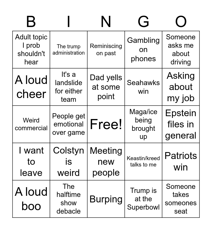 This bingo card has a free space and 24 words: Colstyn is weird, The halftime show debacle, Dad yells at some point, A loud boo, Someone asks me about driving, Adult topic I prob shouldn't hear, A loud cheer, The trump administration, Maga/ice being brought up, Meeting new people, Seahawks win, Weird commercial, Keastin/kreed talks to me, Patriots win, It's a landslide for either team, Trump is at the Superbowl, Epstein files in general, Reminiscing on past, Asking about my job, People get emotional over game, Someone takes someones seat, I want to leave, Gambling on phones and Burping.