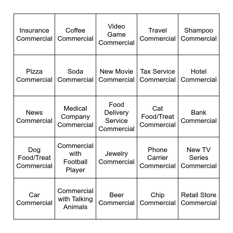 This bingo card has 28 words: New TV Series Commercial, Fast Food Chain Commercial, Tax Service Commercial, Chip Commercial, Pizza Commercial, Video Game Commercial, Coffee Commercial, Dog Food/Treat Commercial, Cat Food/Treat Commercial, Car Commercial, News Commercial, Travel Commercial, Commercial with Talking Animals, Beer Commercial, Hotel Commercial, Candy Commercial, Commercial with Football Player, Soda Commercial, New Movie Commercial, Jewelry Commercial, Insurance Commercial, Retail Store Commercial, Food Delivery Service Commercial, Medical Company Commercial, Bank Commercial, Phone Carrier Commercial, Shampoo Commercial and Social Media Commercial.