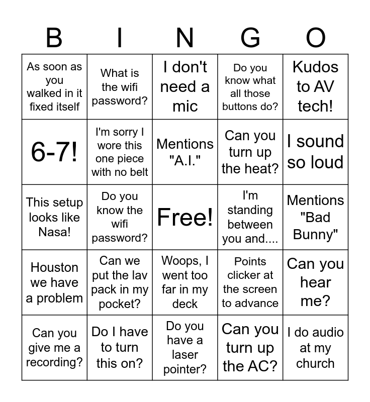This bingo card has a free space and 28 words: Can you hear me?, You can put that in my car, Can you turn up the heat?, Can you turn up the AC?, 6-7!, I don't need a mic, What is the wifi password?, Houston we have a problem, I'm standing between you and...., Can you give me a recording?, This setup looks like Nasa!, Do you know what all those buttons do?, Do I have to turn this on?, Do you have a laser pointer?, I sound so loud, I'm hearing an echo, Can we put the lav pack in my pocket?, I'm sorry I wore this one piece with no belt, Mentions "A.I.", Woops, I went too far in my deck, As soon as you walked in it fixed itself, Can I charge my phone?, I do audio at my church, Do you know the wifi password?, Mentions "Bad Bunny", Points clicker at the screen to advance, Kudos to AV tech! and Presenter "no show".