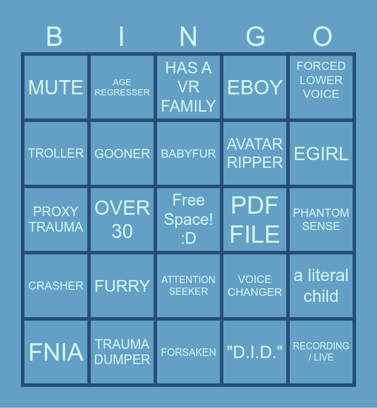 This bingo card has a free space and 24 words: FNIA, FURRY, BABYFUR, "D.I.D.", FORCED LOWER VOICE, MUTE, AGE REGRESSER, HAS A VR FAMILY, PDF FILE, PHANTOM SENSE, PROXY TRAUMA, GOONER, VOICE CHANGER, a literal child, TROLLER, TRAUMA DUMPER, FORSAKEN, EBOY, EGIRL, CRASHER, OVER 30, ATTENTION SEEKER, AVATAR RIPPER and RECORDING / LIVE.