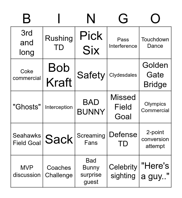 This bingo card has a free space and 40 words: Seahawks Touchdown, "Ghosts", Interception, Bob Kraft, Coaches Challenge, Screaming Fans, Safety, Fumble, Touchdown Dance, Seahawks Field Goal, Interception, Pass Interference, "Here's a guy..", Olympics Commercial, Missed Field Goal, Sack, Go for it on 4th Down, 3rd and long, Strip Sack, Pick Six, 2-point conversion attempt, Celebrity sighting, Clydesdales, Coke commercial, Defensive Fumble Recovery, Movie Trailer, Red Zone Stop, Shirtless Fan, Cheerleaders, Car Commercial, Previous SB mentioned, MVP discussion, Special Teams TD, Defense TD, Golden Gate Bridge, Bad Bunny surprise guest, Unsportsmanlike Conduct, Holding, Rushing TD and Receiving TD.