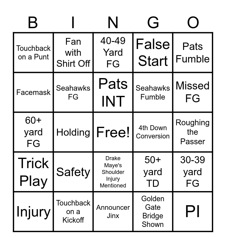 This bingo card has a free space and 38 words: Pats TD, Seahawks TD, Pats FG, Seahawks FG, 30-39 yard FG, Safety, Pats INT, Seahawks INT, Pats Fumble, Seahawks Fumble, Holding, False Start, PI, Roughing the Passer, Facemask, Trick Play, Onside Kick, 40-49 Yard FG, 50-59 Yard FG, 4th Down Conversion, Touchback on a Punt, Touchback on a Kickoff, Missed FG, Injury, Aerial View of Levi's Stadium, Announcer Jinx, Drake Maye's Age Mentioned, OT, Legion of Boom Mentioned, Super Bowl XLIX Mentioned, Bill Belichick Mentioned, Drake Maye's Shoulder Injury Mentioned, Golden Gate Bridge Shown, Fan with Shirt Off, 25+ yard TD, 50+ yard TD, 60+ yard FG and Offsides.