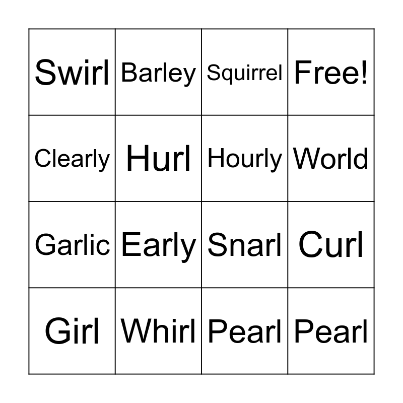This bingo card has 17 words: Pearl, Girl, Squirrel, Swirl, Early, Free!, Curl, Hourly, World, Hurl, Whirl, Snarl, Clearly, Barley, Garlic, Twirl and Pearl.