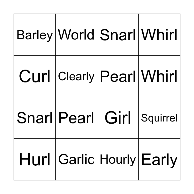This bingo card has 32 words: Free!, Girl, Squirrel, Swirl, Early, Pearl, Curl, Hourly, World, Hurl, Whirl, Snarl, Clearly, Barley, Garlic, Twirl, Pearl, Girl, Squirrel, Swirl, Early, Curl, Hourly, World, Hurl, Whirl, Snarl, Clearly, Barley, Garlic, Twirl and Pearl.