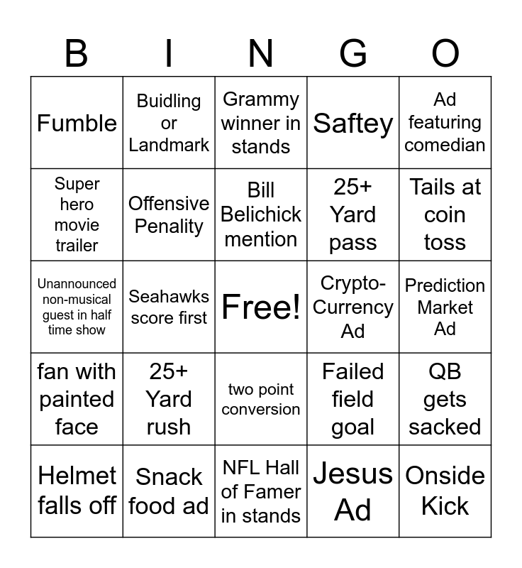This bingo card has a free space and 31 words: NFL Hall of Famer in stands, Holding penalty, Seahawks score first, False start, Fumble, Grammy winner in stands, Offensive Penality, Failed field goal, Crypto-Currency Ad, Jesus Ad, Prediction Market Ad, Onside Kick, Touchdown Dance, Total Points is 50+, Tails at coin toss, Interception, QB gets sacked, 25+ Yard rush, fan with painted face, two point conversion, Ad featuring comedian, Betting Ad, Helmet falls off, Buidling or Landmark, 25+ Yard pass, Super hero movie trailer, Saftey, Unannounced non-musical guest in half time show, Snack food ad, Bill Belichick mention and Streaker.
