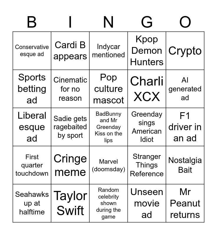 This bingo card has a free space and 24 words: Cringe meme, Taylor Swift, Pop culture mascot, Seahawks up at halftime, Crypto, Conservative esque ad, Sports betting ad, Cardi B appears, Greenday sings American Idiot, Marvel (doomsday), Charli XCX, Liberal esque ad, Stranger Things Reference, Nostalgia Bait, Cinematic for no reason, Unseen movie ad, F1 driver in an ad, Indycar mentioned, AI generated ad, Sadie gets ragebaited by sport, Mr Peanut returns, First quarter touchdown, Kpop Demon Hunters and Random celebrity shown during the game.