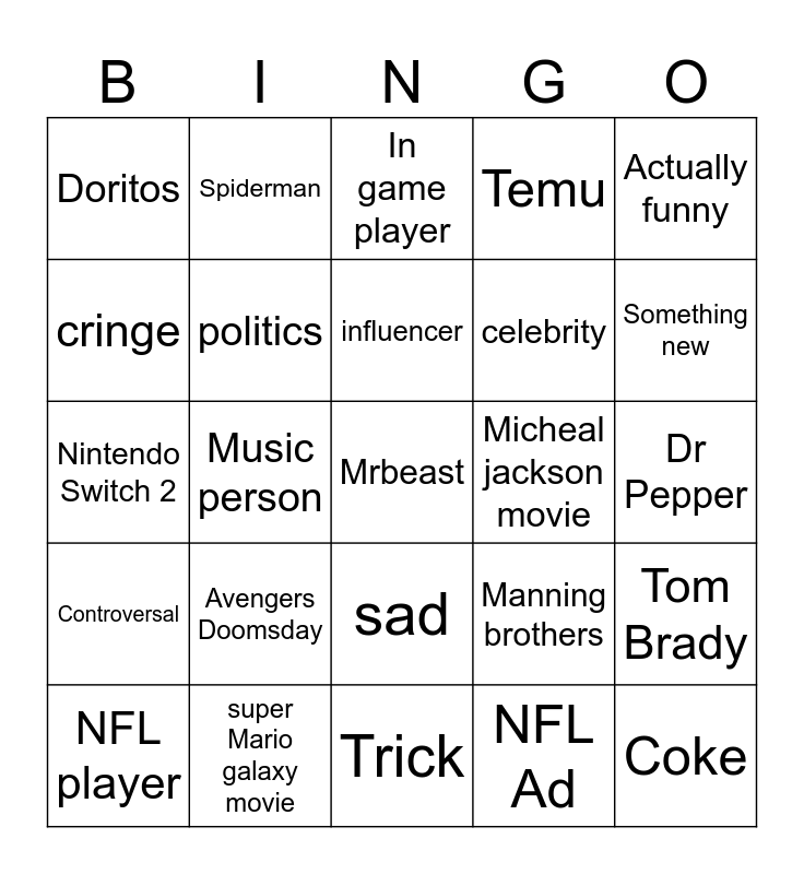 This bingo card has a free space and 24 words: Avengers Doomsday, super Mario galaxy movie, influencer, NFL player, Actually funny, Doritos, cringe, Spiderman, Micheal jackson movie, sad, celebrity, Nintendo Switch 2, Manning brothers, Tom Brady, politics, NFL Ad, Dr Pepper, In game player, Something new, Music person, Coke, Controversal, Temu and Trick.