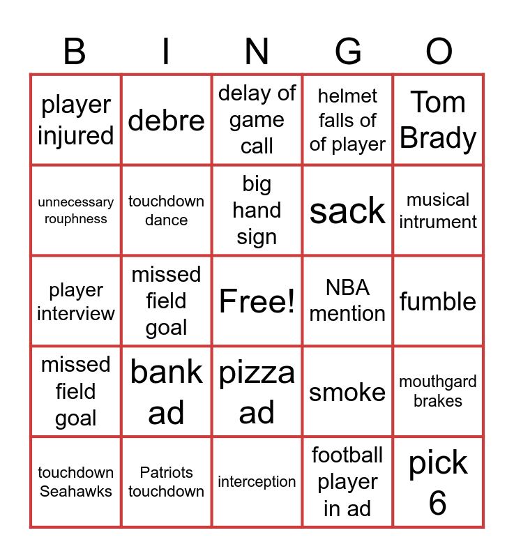 This bingo card has a free space and 29 words: touchdown Seahawks, offsides, missed field goal, crazy fan, player injured, delay of game call, touchdown dance, bank ad, NBA mention, Patriots touchdown, fumble, pick 6, interception, football player in ad, musical intrument, angry coach yelling at player, pizza ad, missed field goal, Tom Brady, player interview, smoke, 70 yard gain, sack, unnecessary rouphness, helmet falls of of player, debre, mouthgard brakes, big hand sign and field goal.