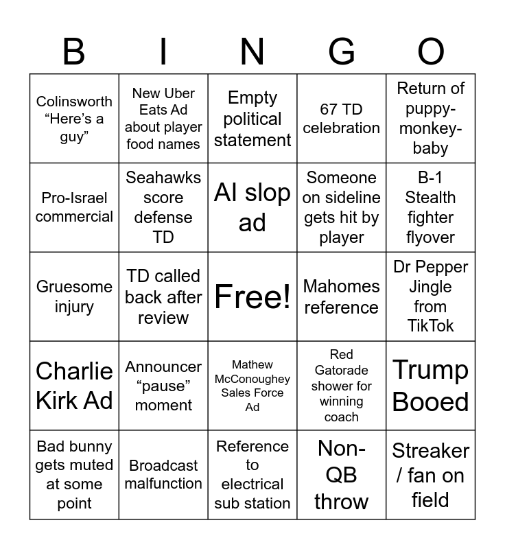 This bingo card has a free space and 24 words: Announcer “pause” moment, Broadcast malfunction, AI slop ad, Bad bunny gets muted at some point, Return of puppy-monkey-baby, Colinsworth “Here’s a guy”, Pro-Israel commercial, New Uber Eats Ad about player food names, Mahomes reference, Mathew McConoughey Sales Force Ad, Someone on sideline gets hit by player, Gruesome injury, Red Gatorade shower for winning coach, Trump Booed, Seahawks score defense TD, Non-QB throw, Dr Pepper Jingle from TikTok, Empty political statement, B-1 Stealth fighter flyover, TD called back after review, Streaker / fan on field, Charlie Kirk Ad, 67 TD celebration and Reference to electrical sub station.