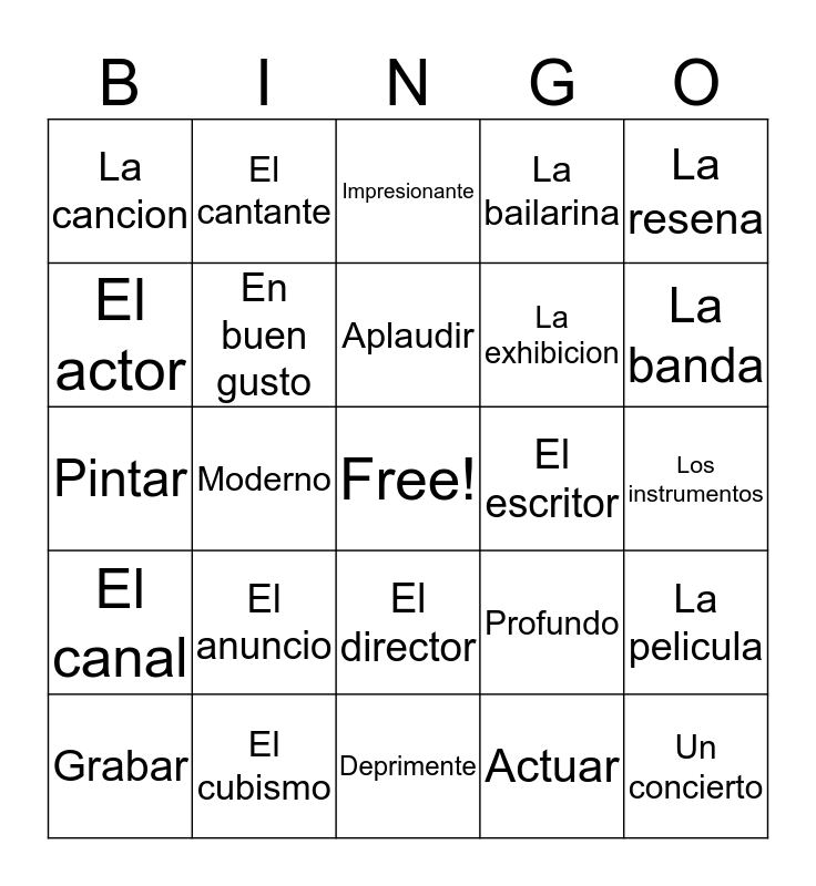 This bingo card has a free space and 24 words: El anuncio, El cubismo, Aplaudir, Grabar, La resena, La cancion, El actor, El cantante, El escritor, El director, La exhibicion, Pintar, Profundo, La pelicula, En buen gusto, Actuar, Los instrumentos, Impresionante, La banda, Moderno, Un concierto, El canal, La bailarina and Deprimente.