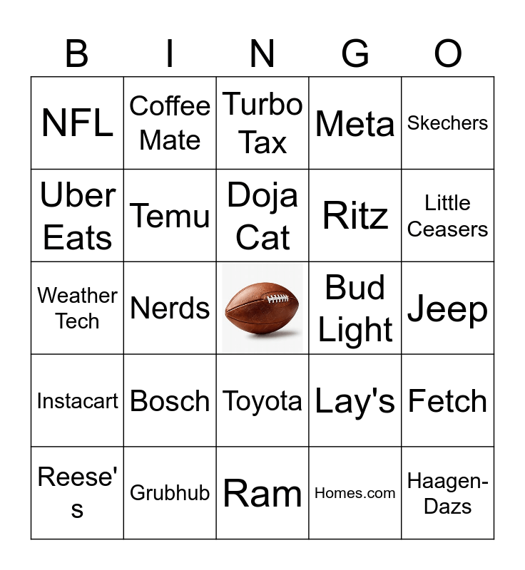 This bingo card has a free space and 24 words: Bosch, Grubhub, Doja Cat, Reese' s, Skechers, NFL, Uber Eats, Coffee Mate, Bud Light, Toyota, Ritz, Weather Tech, Lay's, Fetch, Temu, Homes.com, Jeep, Turbo Tax, Little Ceasers, Nerds, Haagen-Dazs, Instacart, Meta and Ram.