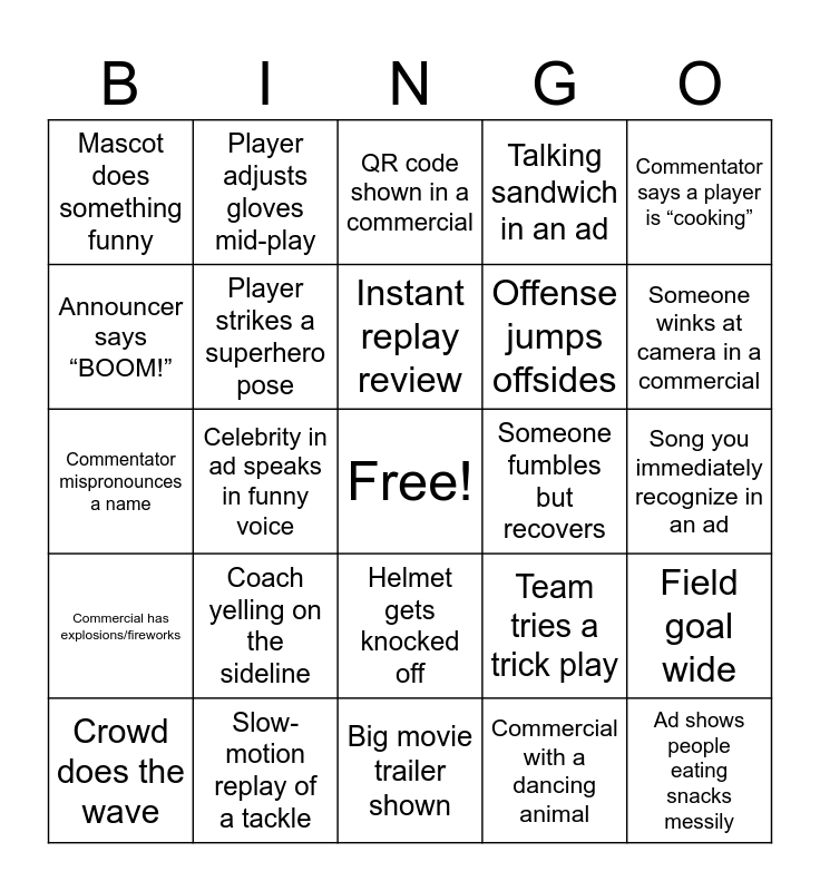 This bingo card has a free space and 24 words: Coach yelling on the sideline, Slow-motion replay of a tackle, Instant replay review, Crowd does the wave, Commentator says a player is “cooking”, Mascot does something funny, Announcer says “BOOM!”, Player adjusts gloves mid-play, Someone fumbles but recovers, Helmet gets knocked off, Offense jumps offsides, Commentator mispronounces a name, Team tries a trick play, Field goal wide, Player strikes a superhero pose, Commercial with a dancing animal, Song you immediately recognize in an ad, QR code shown in a commercial, Someone winks at camera in a commercial, Celebrity in ad speaks in funny voice, Ad shows people eating snacks messily, Commercial has explosions/fireworks, Talking sandwich in an ad and Big movie trailer shown.