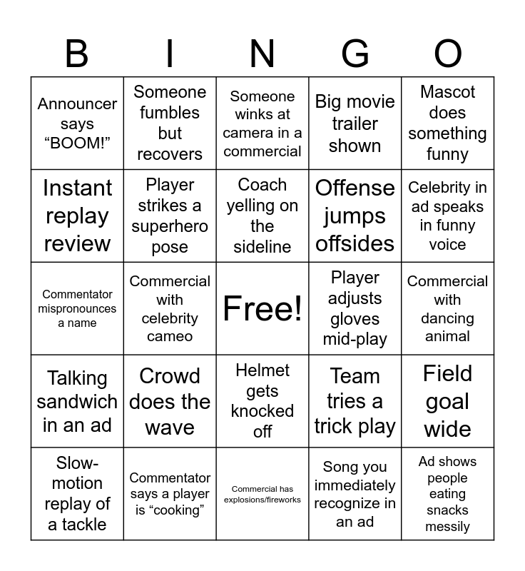 This bingo card has a free space and 24 words: Crowd does the wave, Commentator says a player is “cooking”, Coach yelling on the sideline, Slow-motion replay of a tackle, Mascot does something funny, Announcer says “BOOM!”, Instant replay review, Someone fumbles but recovers, Player adjusts gloves mid-play, Helmet gets knocked off, Offense jumps offsides, Commentator mispronounces a name, Team tries a trick play, Field goal wide, Player strikes a superhero pose, Song you immediately recognize in an ad, Commercial with dancing animal, Someone winks at camera in a commercial, Celebrity in ad speaks in funny voice, Commercial with celebrity cameo, Ad shows people eating snacks messily, Talking sandwich in an ad, Big movie trailer shown and Commercial has explosions/fireworks.