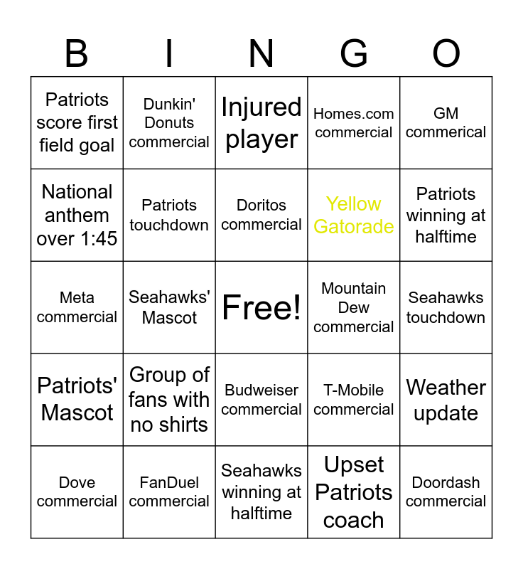 This bingo card has a free space and 42 words: Ford commercial, Doritos commercial, National anthem under 1:45, Group of fans with no shirts, Upset Patriots coach, Weather update, Doordash commercial, Chris Pratt appearance, Injured player, Budweiser commercial, Seahawks touchdown, Patriots winning at halftime, Seahawks' Mascot, GM commerical, Booking.com commercial, T-Mobile commercial, Upset Seahawks coach, Meta commercial, Seahawks win coin toss, Dunkin' Donuts commercial, National anthem over 1:45, Time out, "This is anyone's game" - commentator, Patriots score first field goal, Blue Gatorade, Orange Gatorade, Yellow Gatorade, Red Gatorade, Purple Gatorade, Patriots win coin toss, Seahawks score first field goal, Patriots' Mascot, Patriots touchdown, Seahawks winning at halftime, Tie at halftime, Dove commercial, FanDuel commercial, Mountain Dew commercial, Pepsi commercial, Little Caesars commercial, Homes.com commercial and Taco Bell commercial.