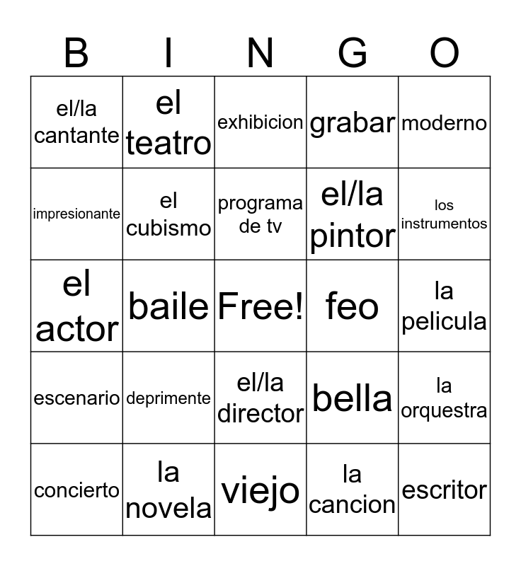 This bingo card has a free space and 24 words: deprimente, la novela, programa de tv, concierto, moderno, el/la cantante, impresionante, el teatro, feo, el/la director, el/la pintor, el actor, bella, la orquestra, el cubismo, la cancion, la pelicula, exhibicion, los instrumentos, baile, escritor, escenario, grabar and viejo.