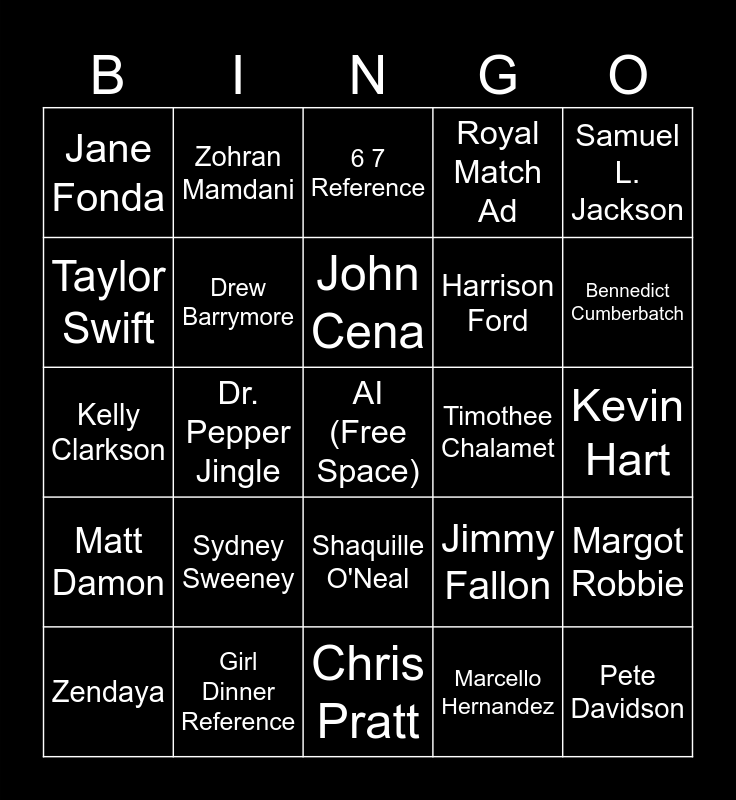 This bingo card has a free space and 24 words: Sydney Sweeney, Girl Dinner Reference, John Cena, Zendaya, Samuel L. Jackson, Jane Fonda, Taylor Swift, Zohran Mamdani, Timothee Chalamet, Shaquille O'Neal, Harrison Ford, Kelly Clarkson, Jimmy Fallon, Margot Robbie, Drew Barrymore, Marcello Hernandez, Kevin Hart, 6 7 Reference, Bennedict Cumberbatch, Dr. Pepper Jingle, Pete Davidson, Matt Damon, Royal Match Ad and Chris Pratt.