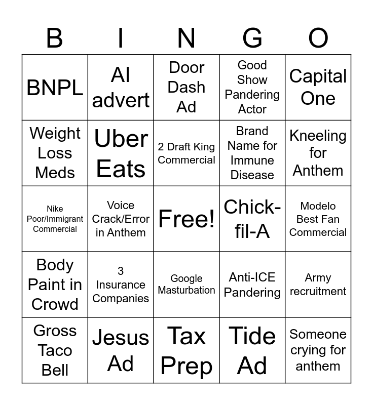 This bingo card has a free space and 24 words: 3 Insurance Companies, Jesus Ad, 2 Draft King Commercial, Gross Taco Bell, Capital One, BNPL, Weight Loss Meds, AI advert, Chick-fil-A, Google Masturbation, Brand Name for Immune Disease, Nike Poor/Immigrant Commercial, Anti-ICE Pandering, Army recruitment, Uber Eats, Tide Ad, Modelo Best Fan Commercial, Door Dash Ad, Kneeling for Anthem, Voice Crack/Error in Anthem, Someone crying for anthem, Body Paint in Crowd, Good Show Pandering Actor and Tax Prep.