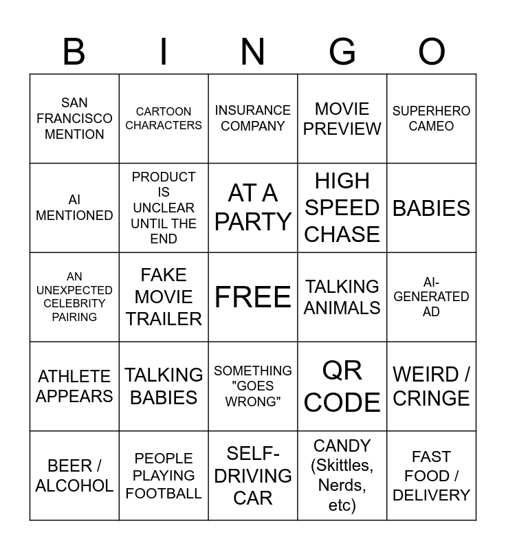 This bingo card has a free space and 39 words: PUPPY APPEARS, CELEBRITY CAMEO, SODA, PRODUCT IS UNCLEAR UNTIL THE END, BEER / ALCOHOL, SOMETHING "GOES WRONG", AT A PARTY, CATCHY JINGLE, SUPERHERO CAMEO, ATHLETE APPEARS, FAKE MOVIE TRAILER, MOVIE PREVIEW, FAST FOOD / DELIVERY, AI-GENERATED AD, TALKING ANIMALS, TALKING BABIES, MASCOTS, SAN FRANCISCO MENTION, NOSTALGIC SONG, QR CODE, AI MENTIONED, SELF-DRIVING CAR, HIGH SPEED CHASE, BABIES, SUPER CRINGE, OUTDATED HUMOR, EMOTIONAL, DANCE BREAK, ANIMALS DOING HUMAN THINGS (OTHER THAN TALKING), CARTOON CHARACTERS, AWKWARD INTERACTION, CHIPS (Lays, Doritos), INSURANCE COMPANY, PEOPLE PLAYING FOOTBALL, CANDY (Skittles, Nerds, etc), CHOCOLATE, WEIRD / CRINGE, AN UNEXPECTED CELEBRITY PAIRING and SOMEONE SCREAMING.